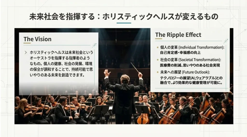 健康な心身、自己成長、そして持続可能な社会の実現。ホーリズムの考え方は、自分自身と社会全体の成長を促し、より良い未来を築くための指針となります。