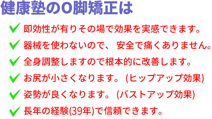 30年に渡るO脚矯正の臨床で積んだ経験と、開業以来34年に渡り、延べ3万7千人以上の様々な方の、悩みの改善のお手伝いをさせていただいた実績で、O脚矯正に取り組んでいます。