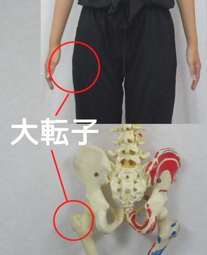 この大転子というのは、本来は真横よりやや後ろ側に位置しています。大腿部が内旋することによって本来の位置からやや前へ移動していきます。