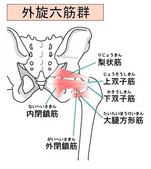 この筋肉群はお尻の真ん中にある仙骨という骨と大転子をつなぐ筋肉です。(一部大腿骨に付いている骨もあります)