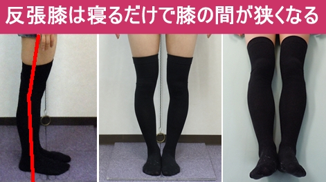 反張膝の多くは実はO脚ではなく場合も結構あります。立った状態だと膝の間が開くが、上向きに寝ると膝の間が閉じるタイプの方です。