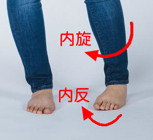 女性のO脚の方は、大腿部が内旋(内ねじれ)している方がほとんどで、同時につま先も内反している方が多いと言えます。内反とは仰向けに寝た時、つま先同士が向かい合う形になります。