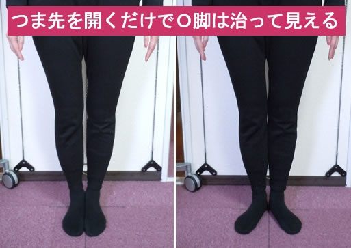 O脚の矯正の写真を見ていると最初(施術前)と最後(施術後)の条件が、変わっている写真を時々見受けられます。つまり、最初はつま先と踵を付けて写真を撮って、最後はつま先を開いて撮るという方法です。